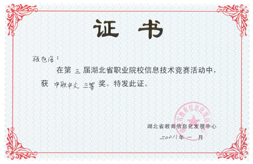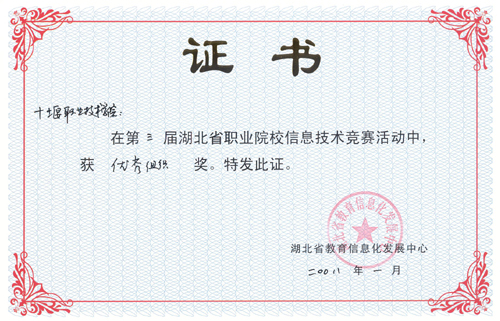 新闻网讯 近日,湖北省教育信息化发展中心表彰了湖北省第三届职业院校信息技术竞赛获奖单位及选手,开云官网计算机工程系学生张旭海同学获高职中文类三等奖,经济贸易系学生徐金凤同学获高职英文类三等奖,计算机工程系学生邓浇华、黄芳、王芳、经济贸易系学生管海翠、林宽同学获高职中文类优秀奖,十堰职业技术学院获优秀组织奖。