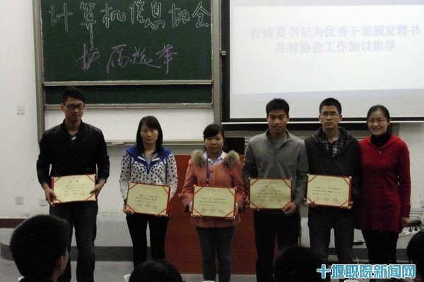 莫足琴书记和赵俊杰老师为协会优秀干部颁发了聘书,信息与智能工程系学生会主席赵亚坤为协会优秀干事颁发荣誉证书。现任计算机信息协会主席王勇对这一年的工作做了汇报总结。