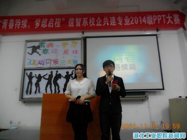 新闻网讯(通讯员 鲁薪霓 许朴)为推动学风建设,提高学生自主学习能力,展示学生青春风采,11月7日晚19:00,信息与智能工程系校企共建专业在4号教学楼4101教室举行“青春延续,梦想启程”PPT演讲大赛。该系党总支书记莫足琴,副主任欧阳艳阶、张明,校企共建专业主任陈方亦,副主任曹艳、肖海霞、郑健及2014级全体师生观看了本次比赛,比赛由2013级学生张中强和王慧主持。
