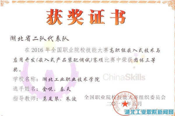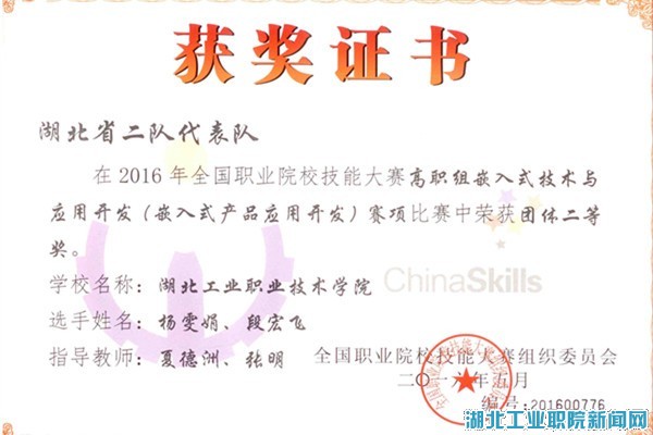新闻网讯(通讯员 彭远)5月8日,经过长达8个小时紧张而持久的竞赛,在全国150多个参赛团队激烈角逐中,2016年全国职业院校技能大赛高职组“嵌入式技术与应用开发”赛项在天津落下帷幕,开云官网信息与智能工程系物联网应用技术专业杨雯娟、嵌入式技术与应用专业段宏飞两名同学获得“嵌入式产品应用开发”团体二等奖,物联网应用技术专业金悦、秦天两名同学获得“嵌入式产品装配调试”团体三等奖,成为湖北在该赛项本年度获奖级别最高、获奖项目全覆盖的唯一参赛院校。