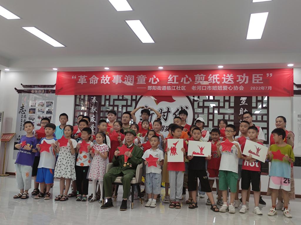 挖掘红色故事,追溯红色记忆。在老河口市临江社区党员活动室,队员们和社区小朋友们一起聆听抗战老兵唐爷爷讲述抗战故事,致敬革命先辈。大家共同学习制作剪纸作品、重温红船精神,把对党的感恩和祝福融入一张张红色剪纸中。